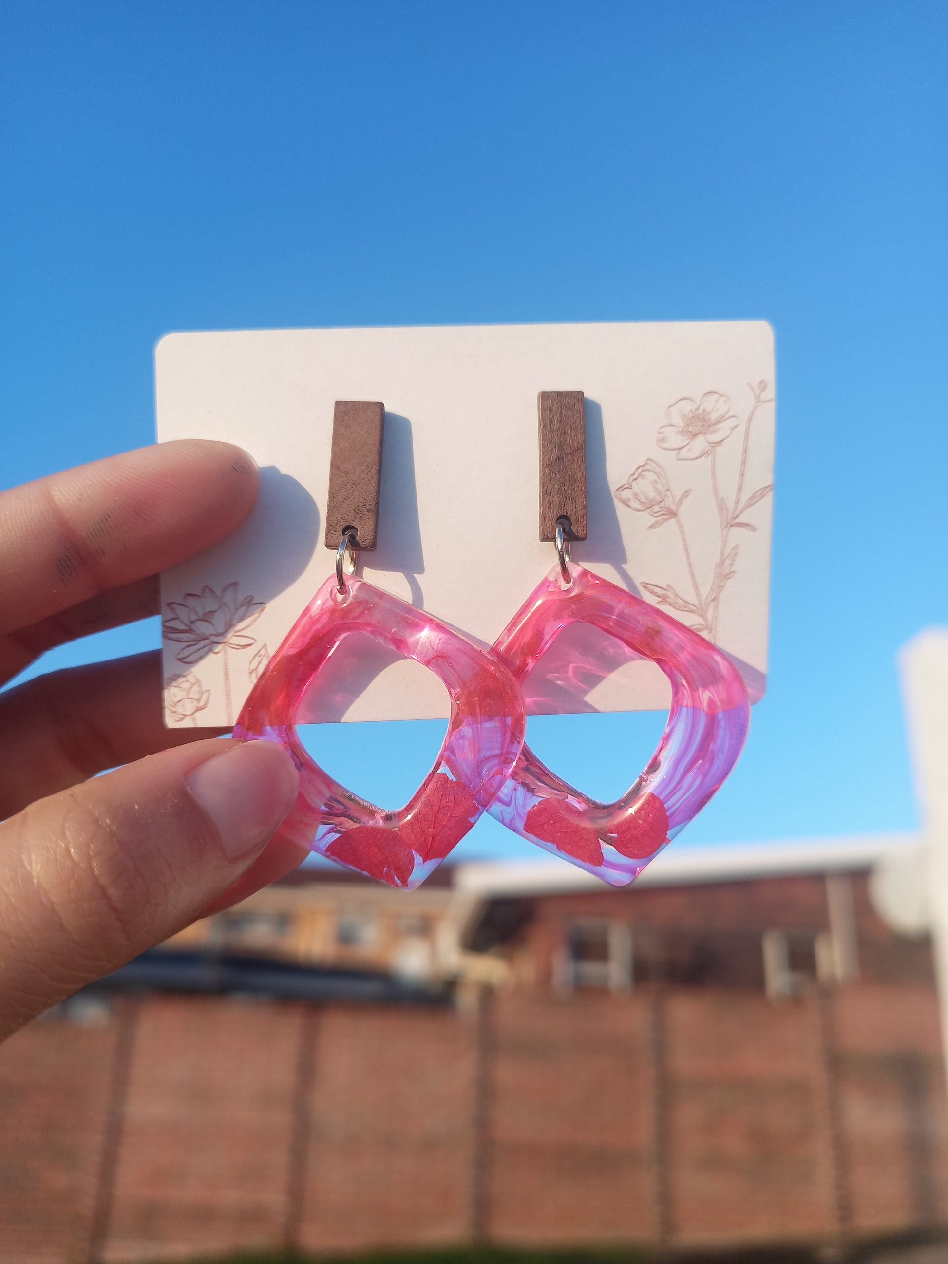 2 tier resin earrings with wooden rectangular stud and red pigment with real pressed flowers.Ā