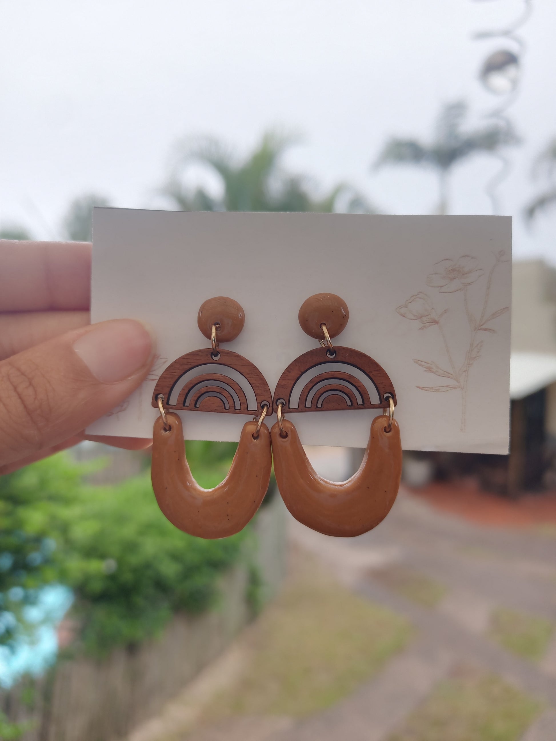 3 tier polymer clay earrings with wooden center piece.Ā