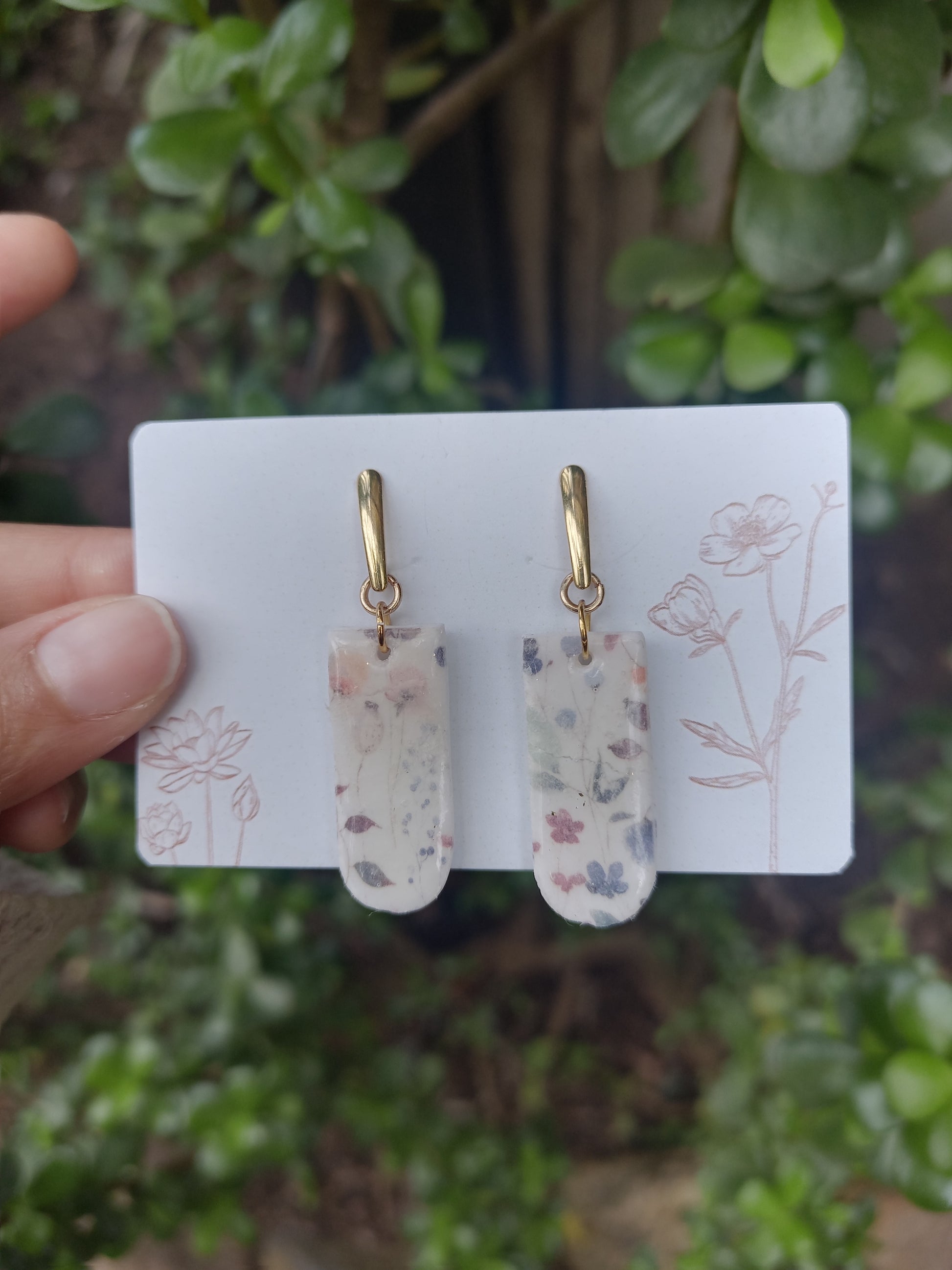 White polymer clay earrings with floral print and gold stud.Ā