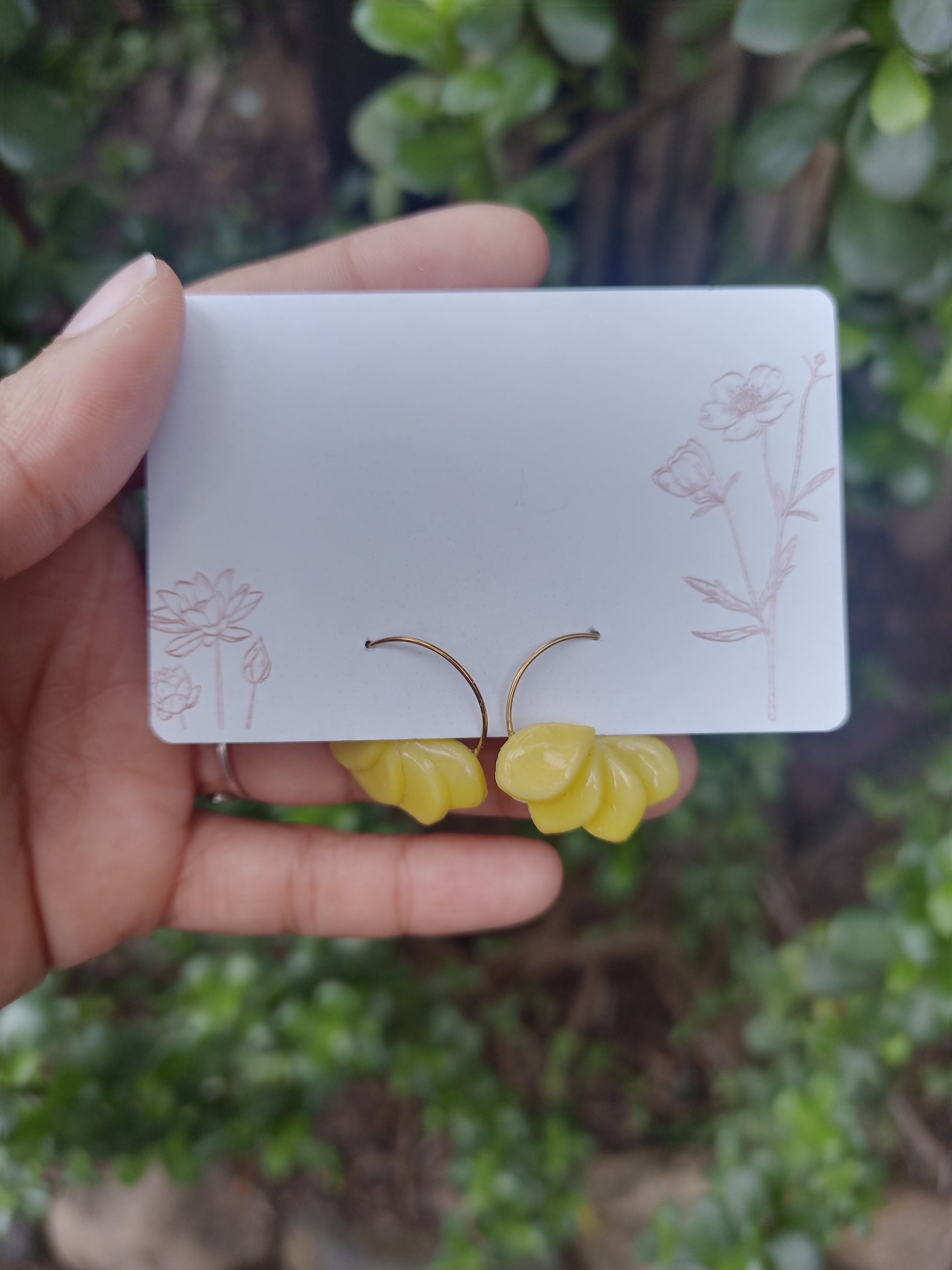 Yellow clay petals on gold hoops.Ā